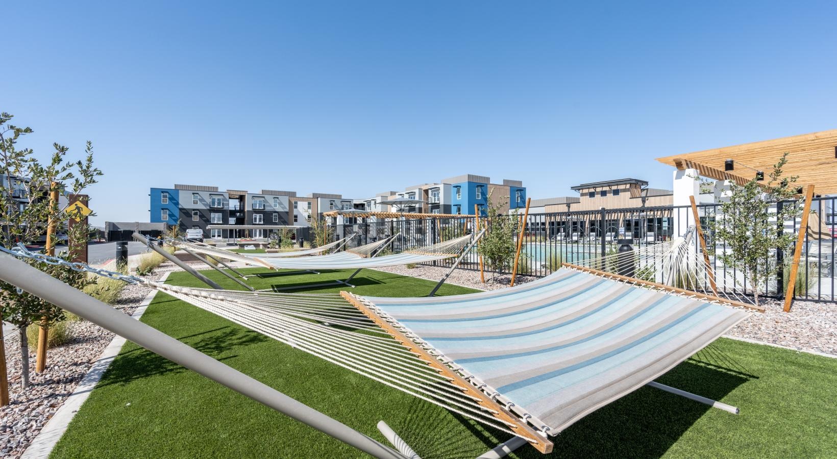 • a swimming pool in front of a building