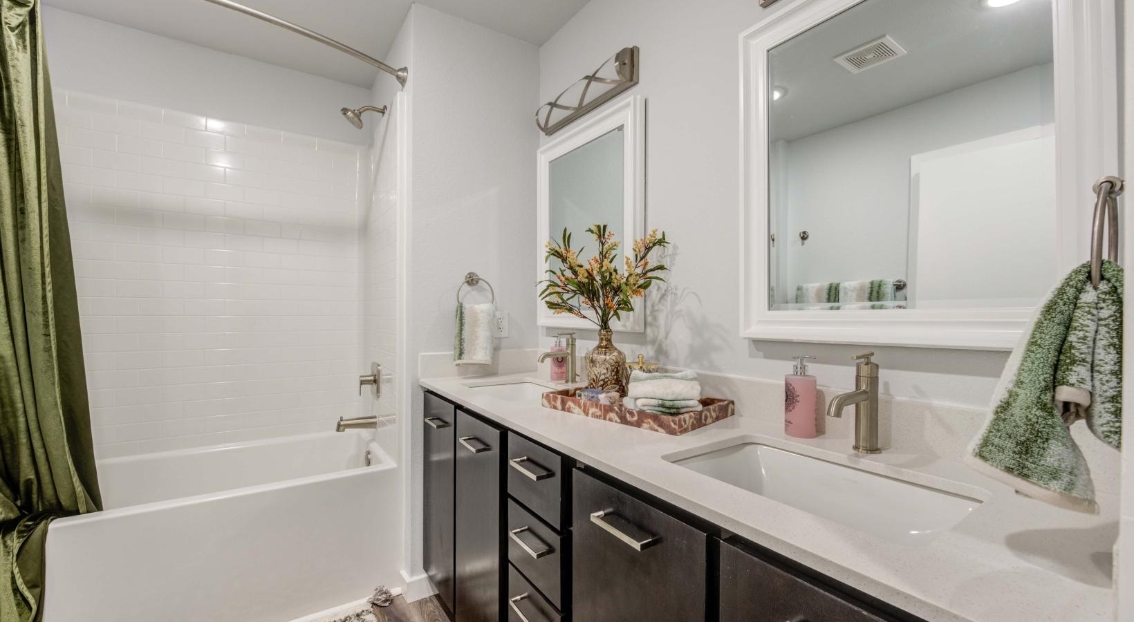 • a bathroom with a tub sink and a mirror